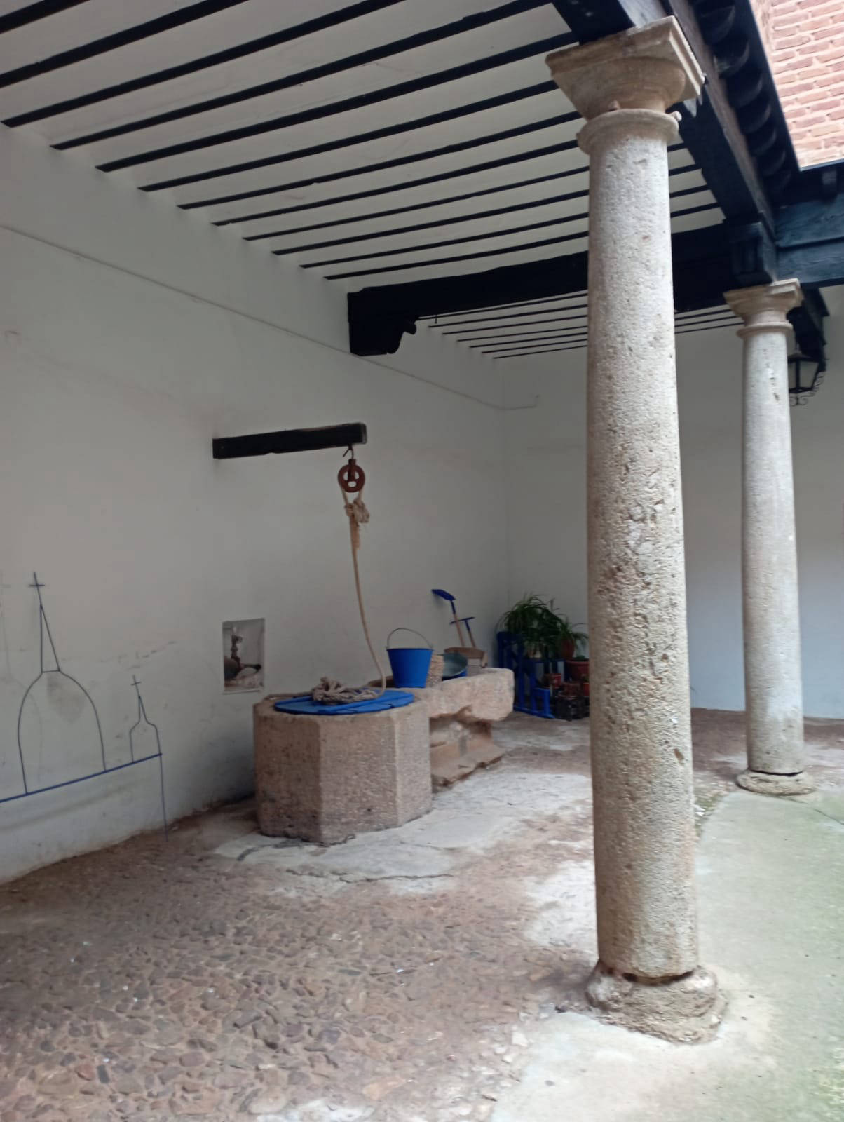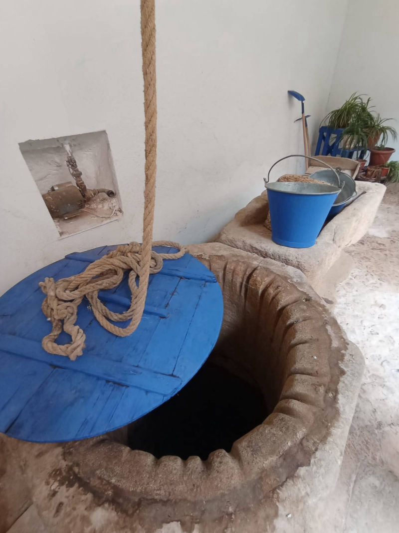En el lado derecho del patio se observar como todavía se conserva tanto el pozo y el lavadero. El pozo está compuesto de piedra con seis caras y su brocal muestra las marcas de desgaste que dejaban las sogas, con las cuales sacaban las agua. El lavadero también está fabricado de piedra.