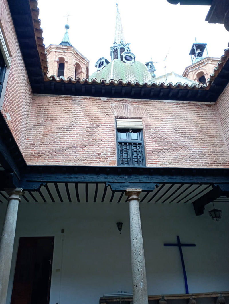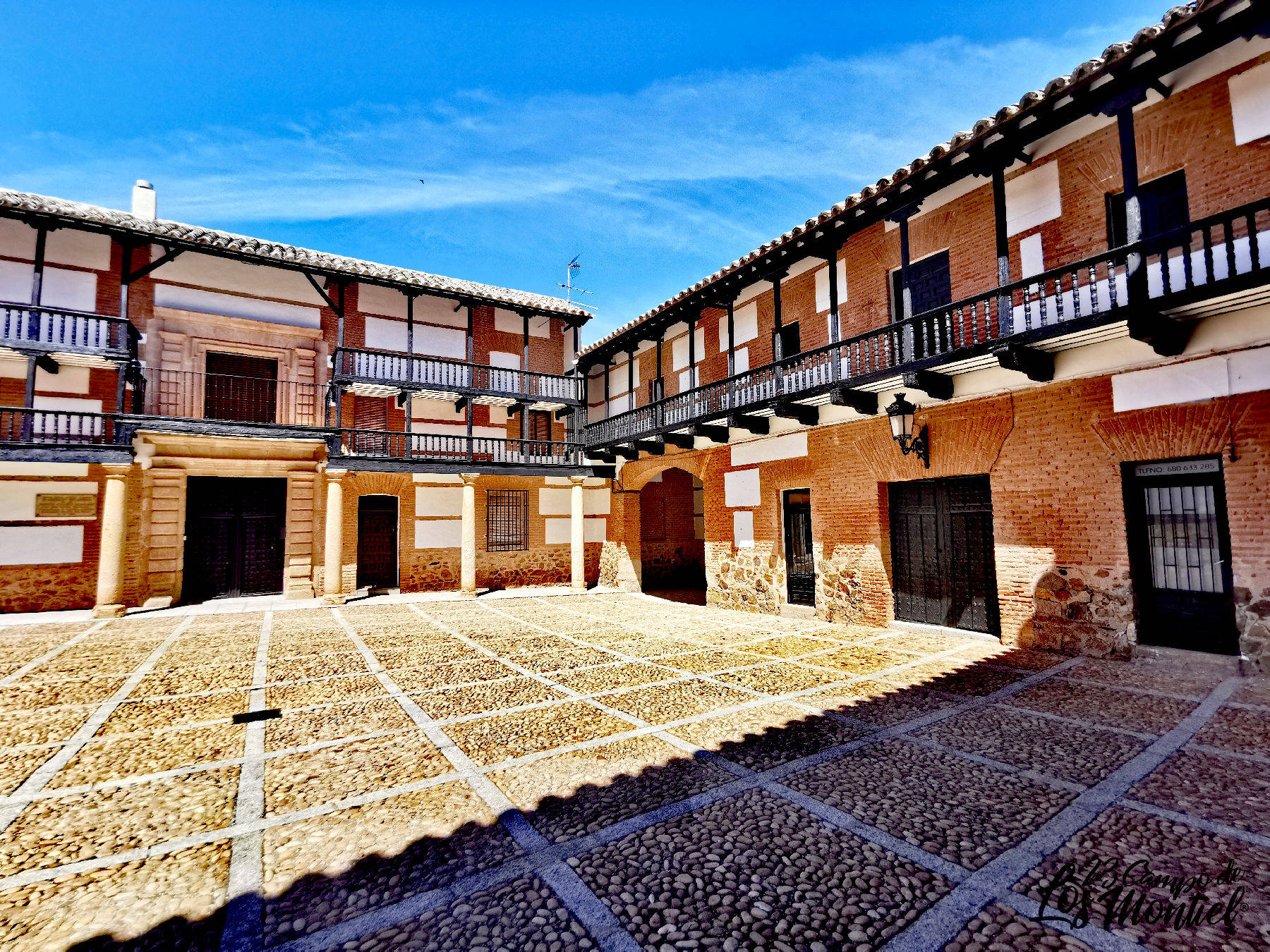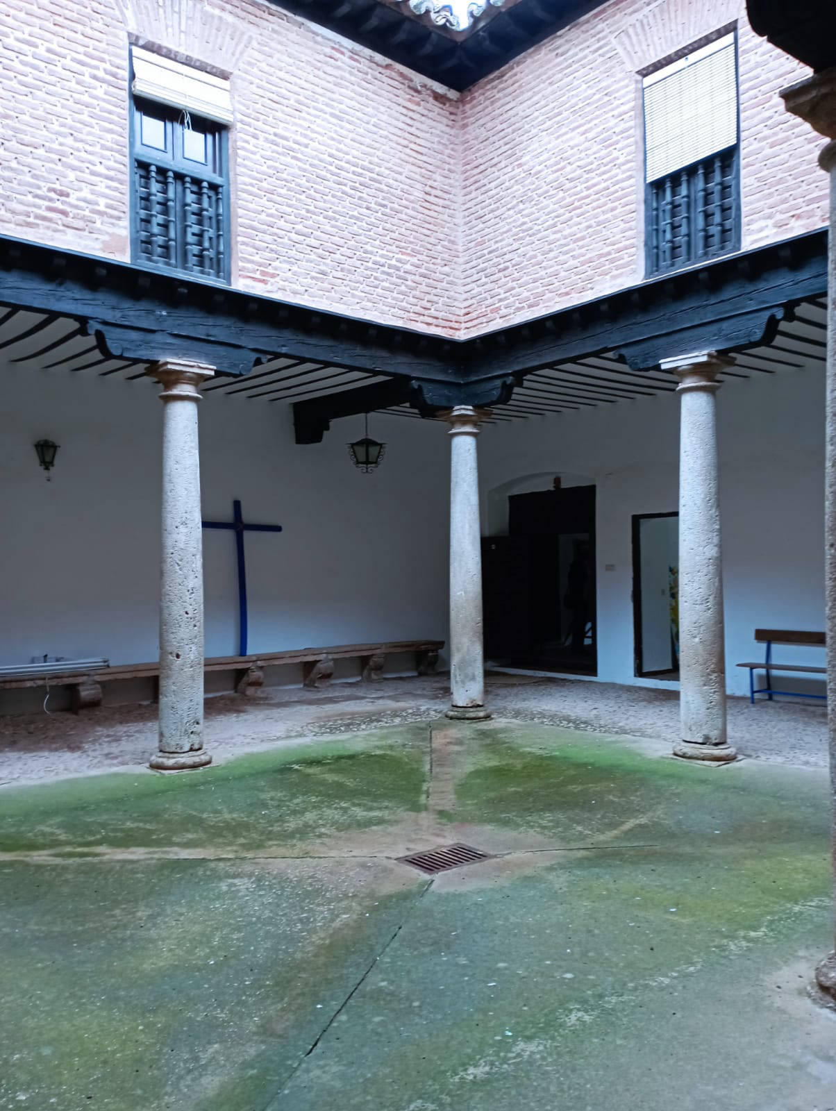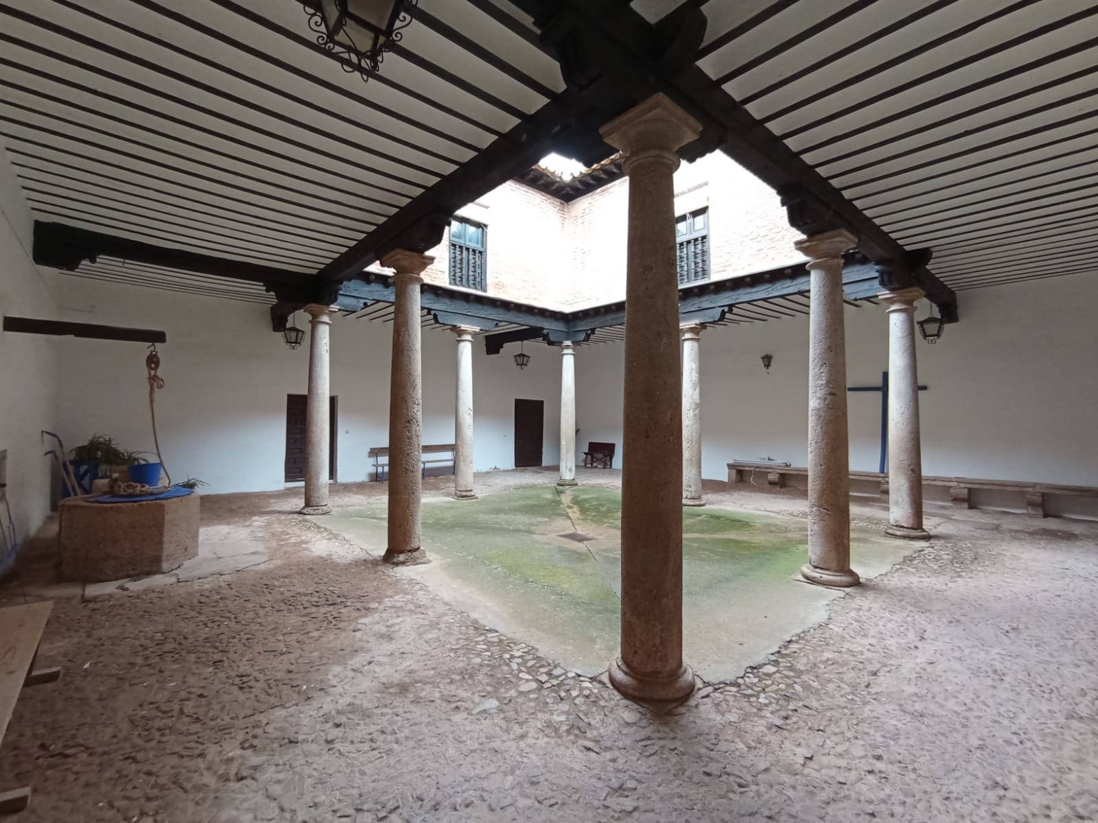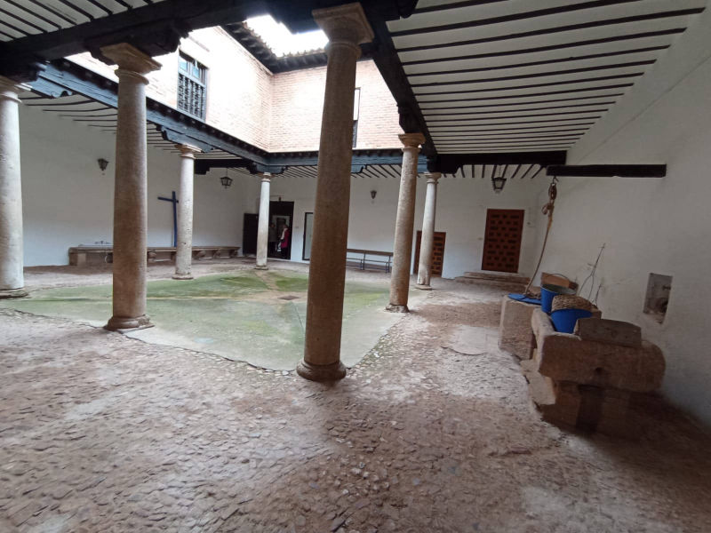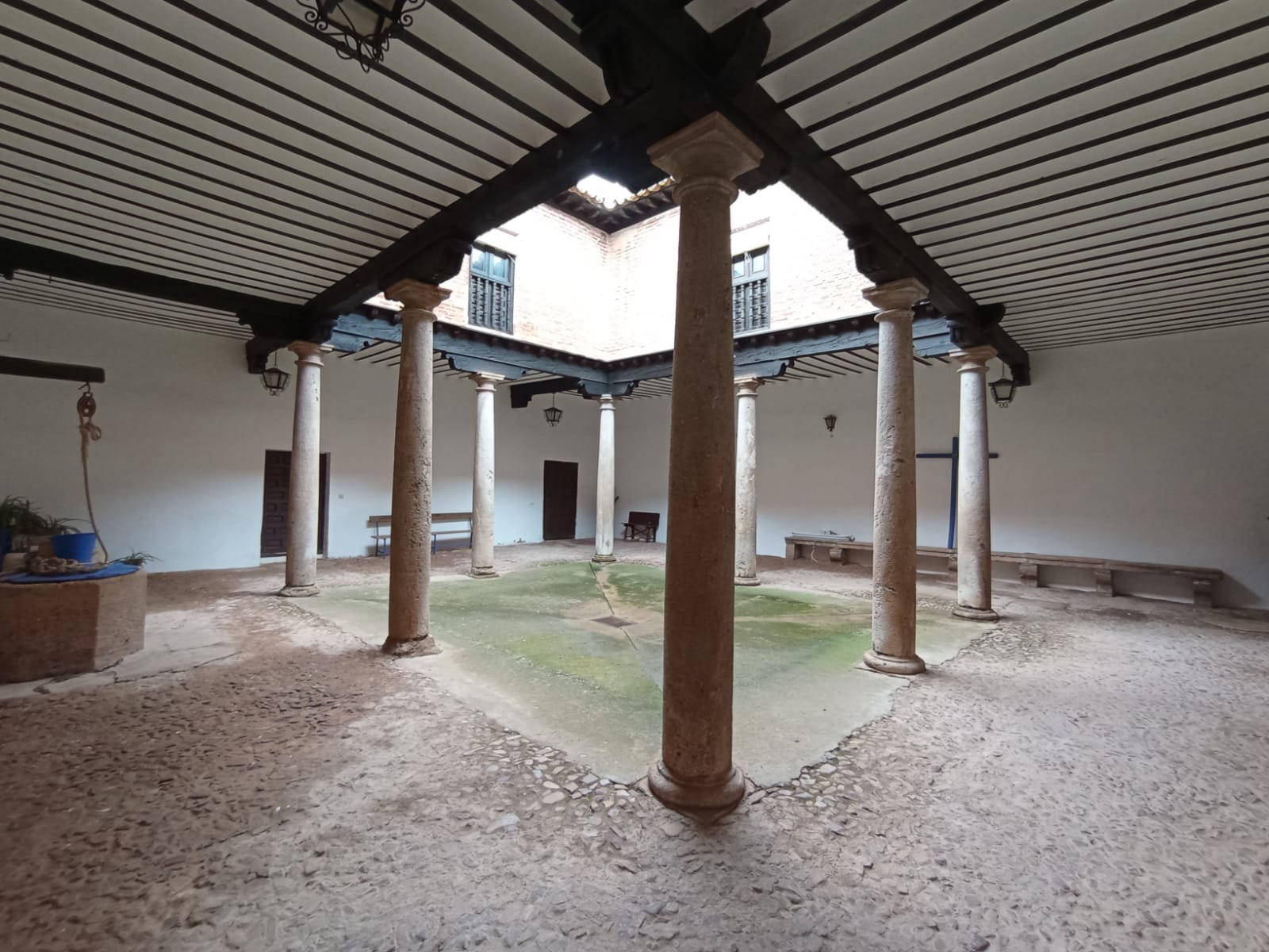 En el interior se sigue la estructura de las casas nobles manchegas, resueltas en torno a un patio. El patio es cuadrado, con tres columnas toscanas por lado, que soportan las zapatas de madera, sobre grandes vigas que sostienen la obra del piso superior.