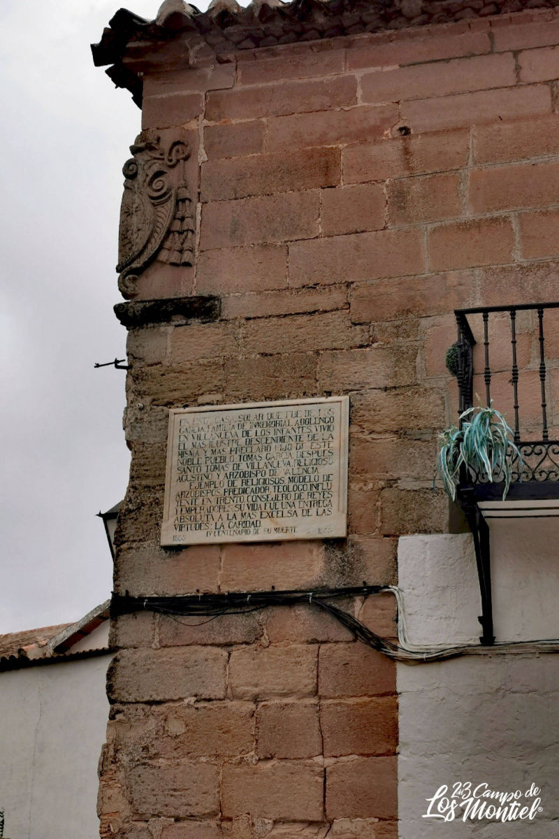 EN ESTA CASA, SOLAR QUE FUE DE LOS GARCIA, FAMILIA DE INMEMORIAL ABOLENGO EN VILLANUEVA DE LOS INFANTES, VIVIO EL MAS ILUSTRE DESCENDIENTE DE LA MISMA Y MAS PRECLARO HIJO DE ESTE NOBLE PUEBLO: TOMAS GARCIA, DESPUES SANTO TOMAS DE VILLANUEVA, RELIGIOSO AGUSTINO Y ARZOBISPO DE VALENCIA. EJEMPLO DE RELIGIOSOS MODELO DE ARZOBISPOS,