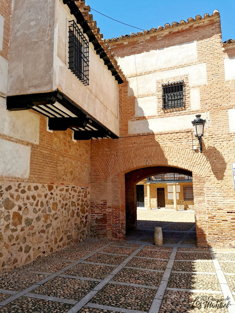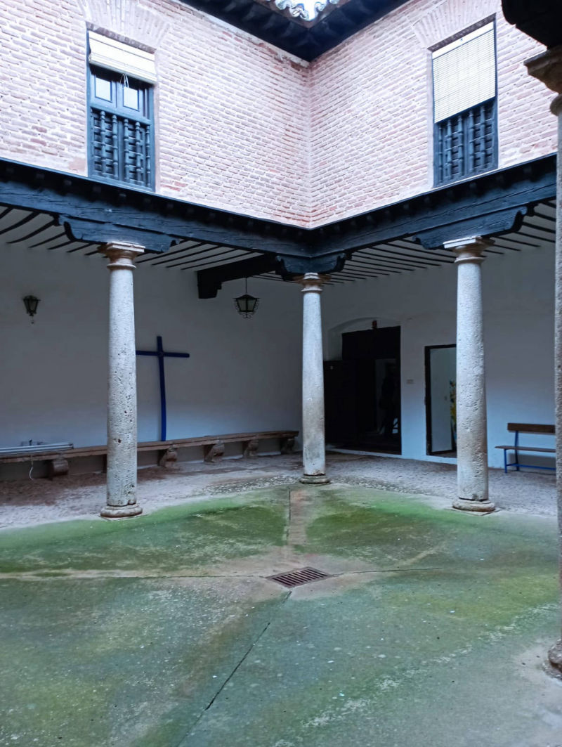 En el interior se sigue la estructura de las casas nobles manchegas, resueltas en torno a un patio. El patio es cuadrado, con tres columnas toscanas por lado, que soportan las zapatas de madera, sobre grandes vigas que sostienen la obra del piso superior.