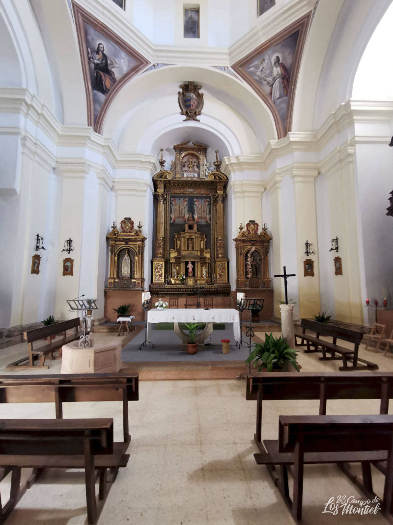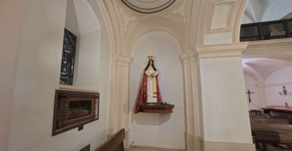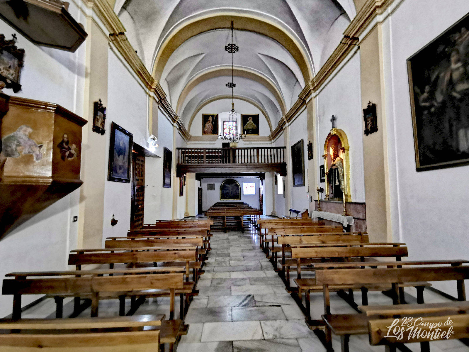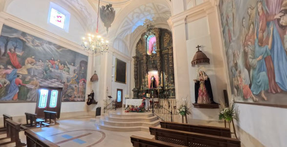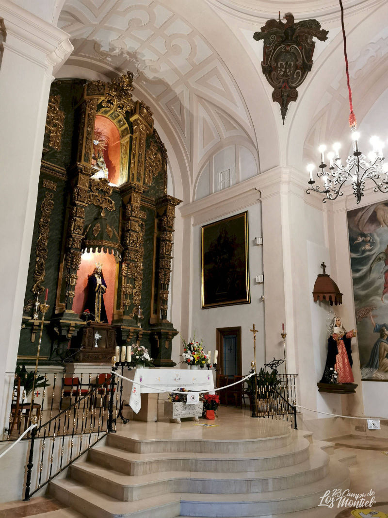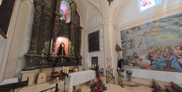 En la fachada destaca el equilibrio de volúmenes y en el interior conserva bellos retablos, destacando El Eucarístico, típico de la Contrarreforma.