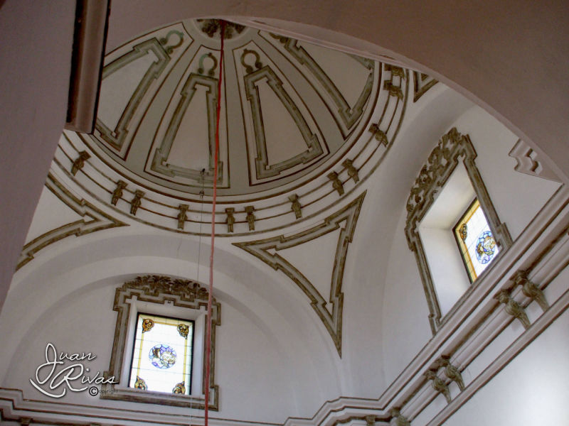 El interior de planta central cuadrada se cubre con media naranja con pechinas, dos cuerpos con pilastras en las esquinas y entablamento, decorado con ménsulas. Tiene vanos recuadrados con orejetas en cada lateral.