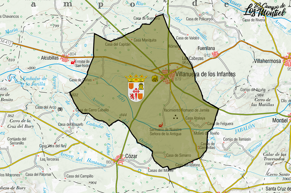 Los ríos más importantes son el Jabalón, afluente del Guadiana que nace a 20 km de Villanueva de los Infantes en Los Ojos de Montiel (Montiel) y el Azuer que nace en el término de Villahermosa, en pleno corazón del Campo de Montiel.